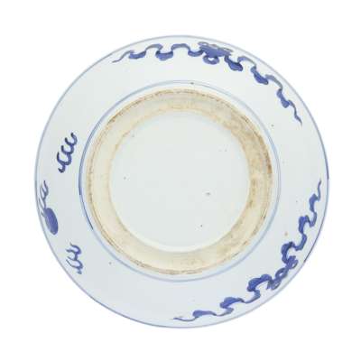 supported on a recessed short foot, the interior painted with three playful Buddhist lions chasing brocade ball stemming with tendrils, the exterior adorned with Buddhist Emblems