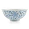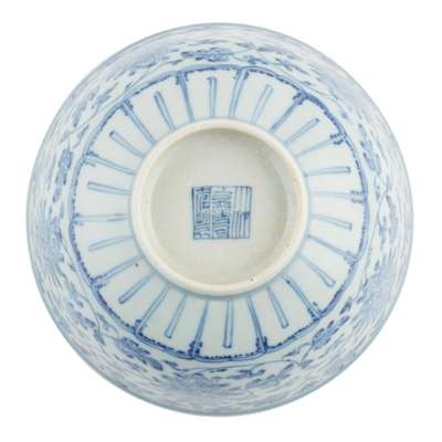 the deep rounded sides painted with continuous scrolling lotus, all above a lappet band from the foot, the base inscribed with a six-character Jiaqing mark