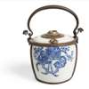 BLUE AND WHITE OIL POT WITH BRASS MOUNT AND HANDLE