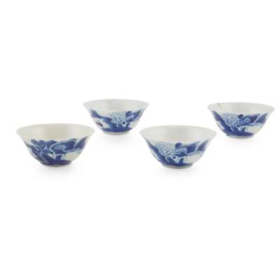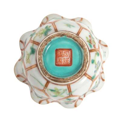 comprising: four blue and white cups, each thinly potted with deep rounded body and flaring mouth, painted to the exterior with shanshui landscape, three with base inscribed with a four-character 'Ruo Shen Zhen Cang' mark, one a four-character Chenghua mark, 6.4cm diameter each; together with three famille rose cups, one a Tongzhi mark and period foliated 'lotus leaf' cup, painted on the exterior and interior with small flowers interspersed among gilded lotus leaf veins, the base inscribed with a four-character Tongzhi mark within double-square in iron-red against a turquoise ground, 6.4cm wide, the other two is a pair of late Qing to early Republic period, 19th-20th century teacups, each thinly potted, painted in iron-red with a dragon in roundel and phoenix on the opposite, all against a yellow ground densely decorated with scrolling flowers, the base with a four-character Guangxu mark, 5.8cm diameter each