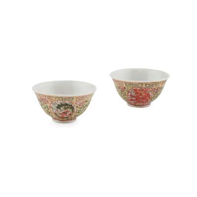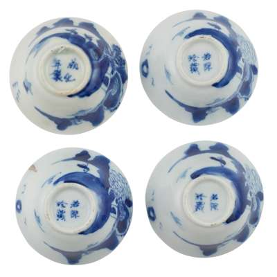 清 若深珍藏及成化款 青花山水人物紋撇口杯四件、清同治及款 粉彩荷葉杯 及 清末民初 光緒款 粉彩龍鳳團紋對杯(共七件)