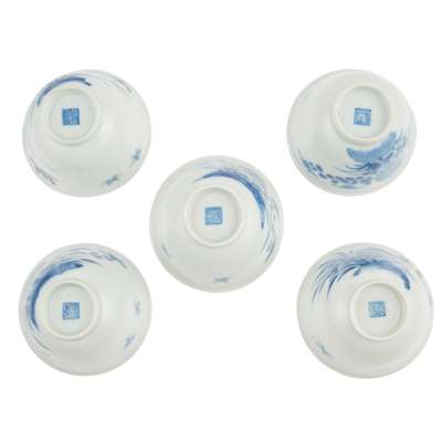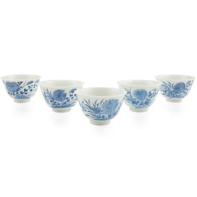 GROUP OF FIVE BLUE AND WHITE CUPS