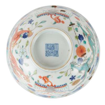 thinly potted, the rounded sides finely painted two pairs of dragons and phoenixes amongst floral bush, the interior with a coiling dragon chasing a flaming pearl within two pairs of double-circles, the base inscribed with a six-character Daoguang mark in underglaze blue