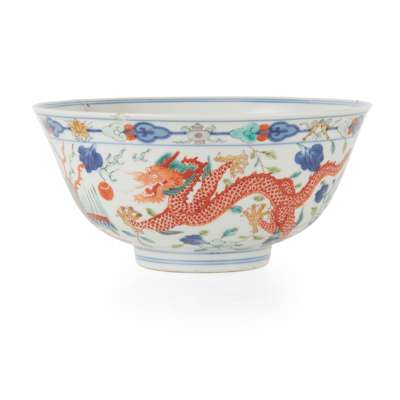Note: A pair of highly comparable Wucai bowls, Daoguang mark and possibly of the period, similarly decorated and in about the same size, were sold in Lyon and Turnbull, 29/09/2021, lot195