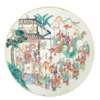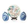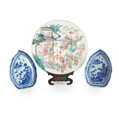 清 青花山水閣樓紋桃形碟(一對)及 粉彩百子閙春圖盤帶木座(共三件)