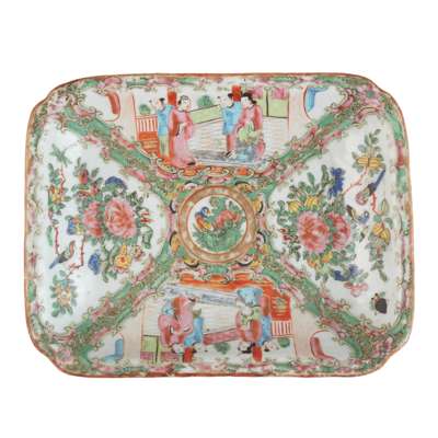 清末民初 各色廣彩人物花鳥紋倒流壺、茶壺、肥皂盒、盤與碟(一組七件)