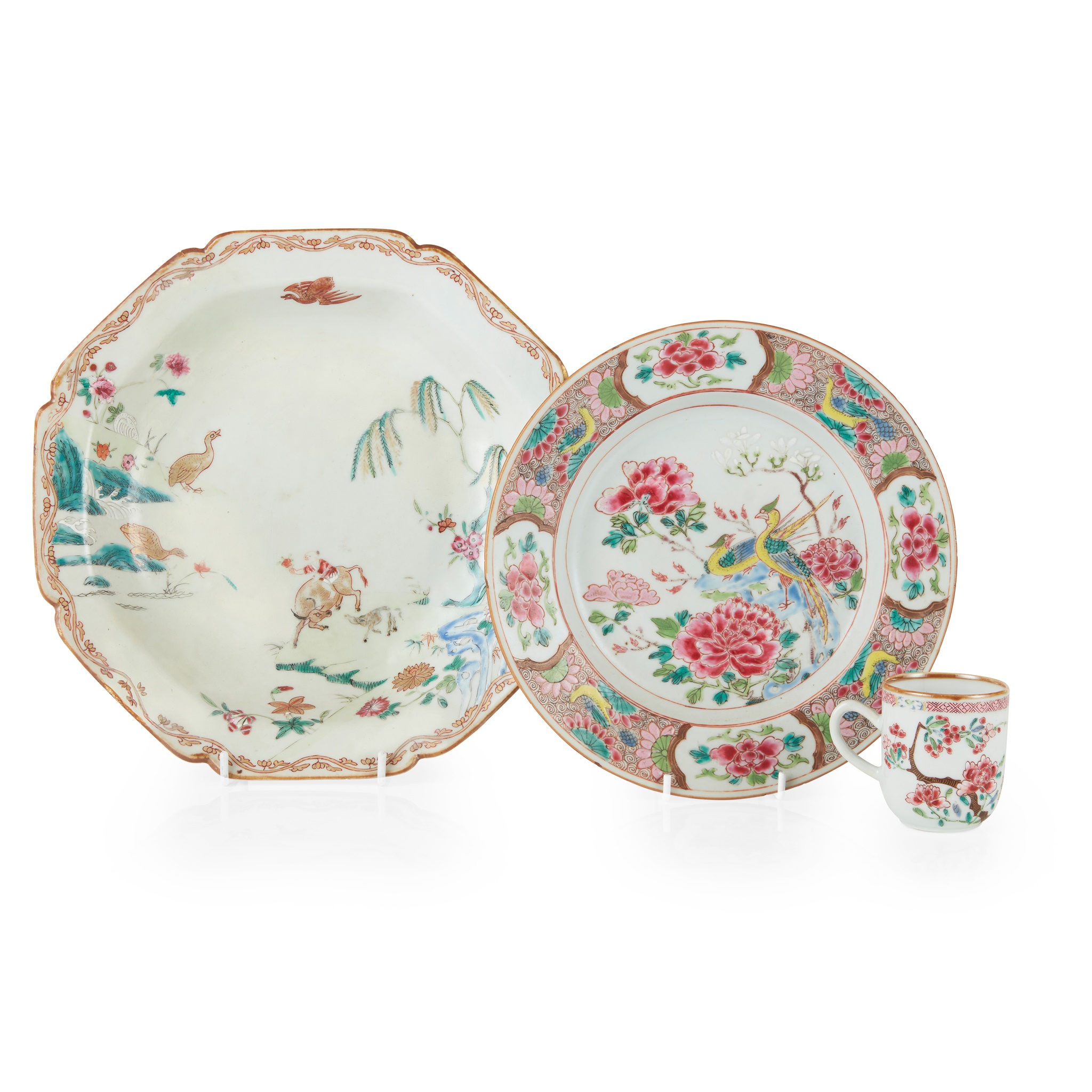 comprising: a foliated deep plate painted with a boy riding on a buffalo issuing a flower to a duck across the water; a circular plate painted with two pheasants standing on rockwork amongst luscious flowers; and a small handled-cup painted with a green peacock before a peony bush