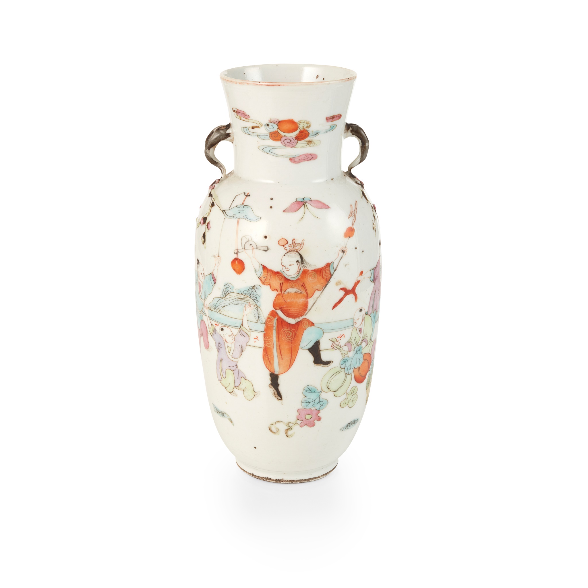 thinly potted, decorated on one side of the body with joyous boys at play on the first day of new year with aubergine, aquamarine, pink, iron-red, and green enamel, moulded on both sides of the neck with a slender loop handle extending to the body raised as branches bearing plum blossom flowers and buds
