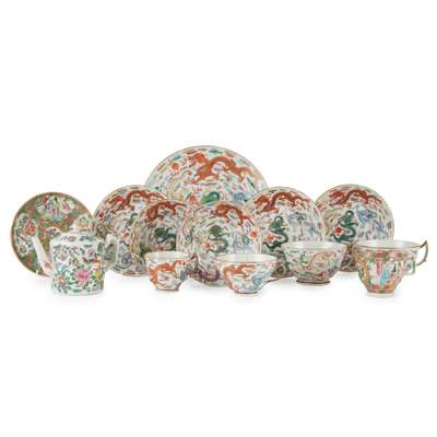 comprising: a plate, three larger, two smaller saucers, two larger, a medium and a small handled cups, all similarly decorated with dragons amongst colourful clouds; together with a Canton Famille Rose teapot, a cup and saucer