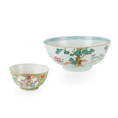 comprising: one big bowl decorated with a pair of rams in a garden; together with a green-ground small bowl with roundels painted with narrative figures