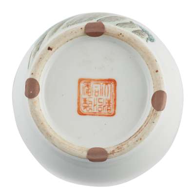 finely painted on the cylindrical body with the Gods of the Three Stars accompanied by attendants in an outdoor setting, the base with a six-character Tongzhi mark in iron-red