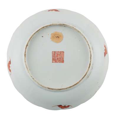 thinly potted with foliated rim, painted to the interior with various floral sprays and butterflies, the base inscribed with a six-character Jiaqing mark in iron red