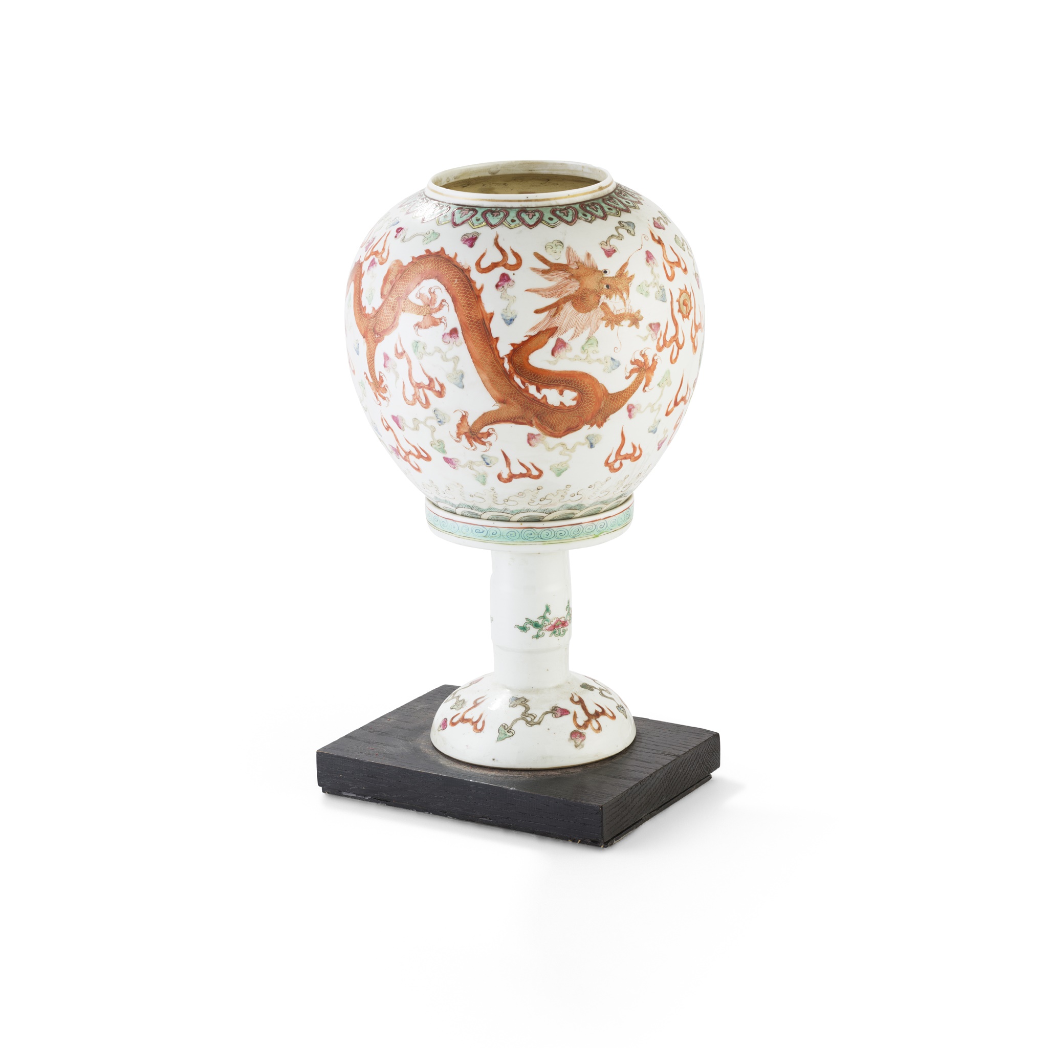 the vase supported on a tall splayed foot, the globular body painted with a large dragon and phoenix amidst flaming clouds, transformed into a lamp shade and attached to a wooden base