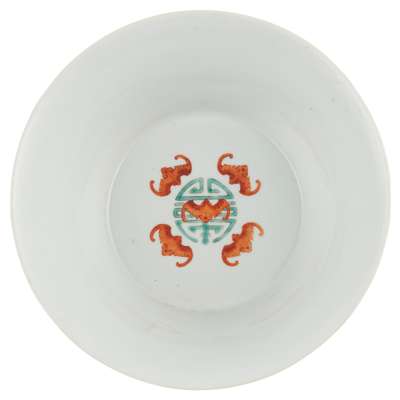 the rounded sides terminating into a splayed rim, the exterior finely decorated with two pairs of five-claw dragons and phoenixes in medallions, all underneath a key-fret band around the mouth rim, the interior painted with five iron-red bats surrounding a longevity shou character, the base inscribed with a six-character Jiaqing mark in underglaze blue