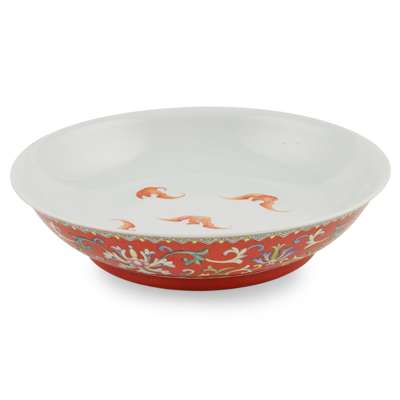 RUBY-RED-GROUND FAMILLE ROSE 'LOTUS AND BAT' PLATE