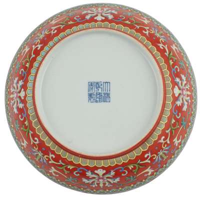 清 乾隆款 珊瑚紅地粉彩番蓮紋五福捧壽盤