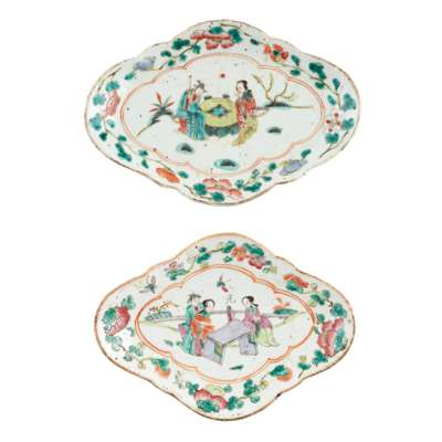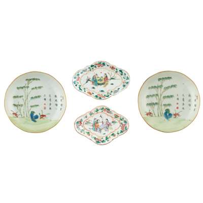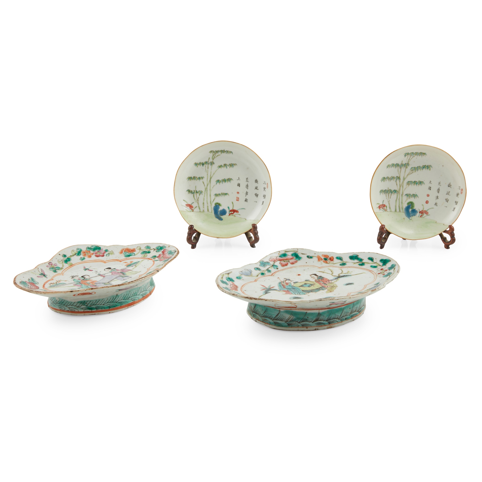 comprising: a pair of quatrefoil stem dishes, each sturdily potted on high foot, the shallow interior painted with figures in garden within two quatrefoil bands further with floral and foliage band; and a pair of dishes, each painted with a bamboo groove, lingzhi fungus, and rockwork to the central left, further inscribed with poem to the right, the base painted with a motif mark in iron-red, with a wooden display stand