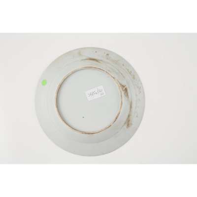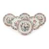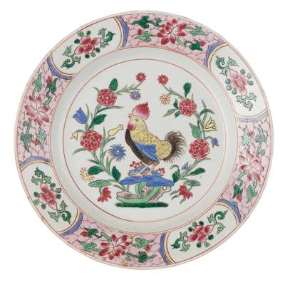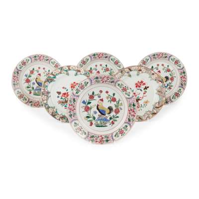 comprising: a set of four plates painted with a rooster standing on rockwork surrounded by foliated peonies stretching upwards, four floral cartouches reserved on pink 'cracked-ice' ground decorating the cavetto; and two plates decorated with floral sprays in the centre