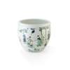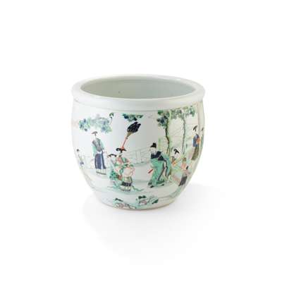 sturdily potted on a countersunk foot, raised to a tapered globular body and lipped rim, painted with narrative figures entering a room welcomed by a music band and guarded by entourage, the base unglazed