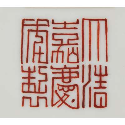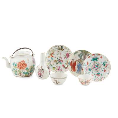 comprising: a 19th-20th century 'peony' teapot, the base inscribed with a four-character Tongzhi mark in iron-red; a 19th-century dish decorated with flowers and butterflies; a 19th-20th century dish decorated with peaches and flowers, the base inscribed with a four-character Tongzhi mark in iron-red; a late 18th-century circular dish decorated with figures, the base inscribed with a six-character Jiaqing mark in iron-red; two 18th-century teacups; and a small 19th-20th century 'Wushuang Pu' vase