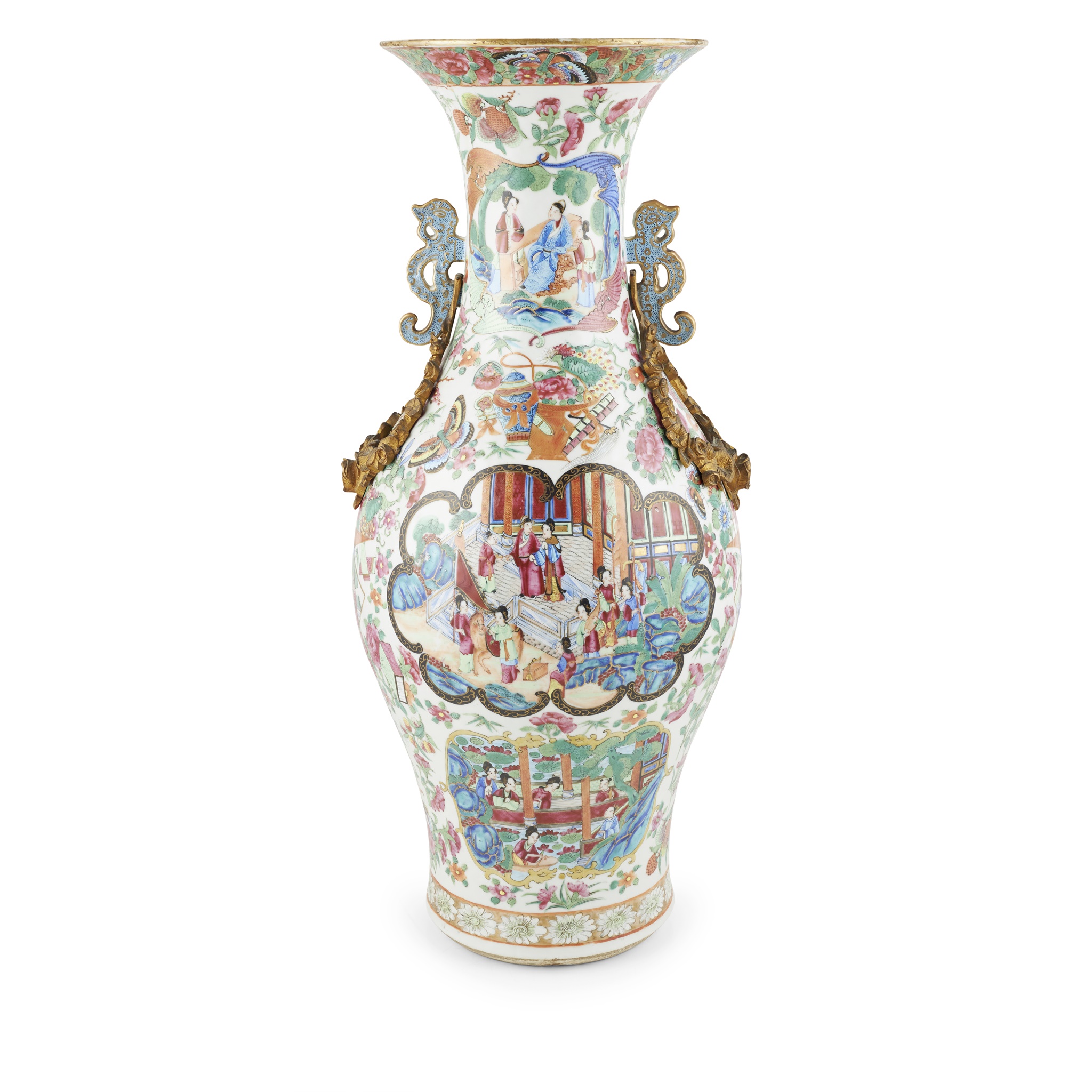 heavily potted, painted on the body with several foliated, kui dragon-formed and bat-formed cartouches with figures, all reserved on a ground painted with flowers, butterflies, and auspicious symbols, the neck flanked with a pair of stylised mythical beast handles, further with gilt filigree mounts in European style