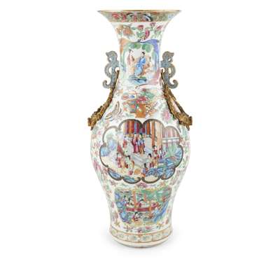 清 廣彩開窗人物故事紋夔耳嵌歐洲風格銅飾大瓶