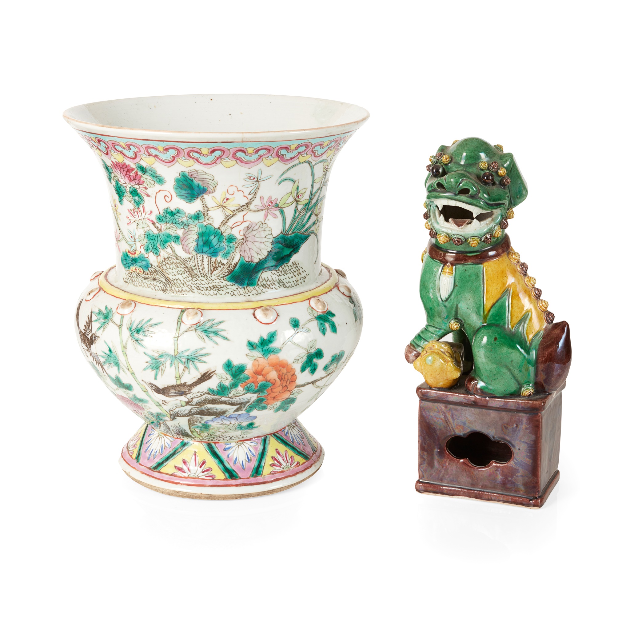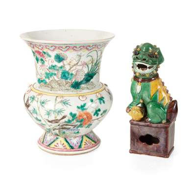 十九至二十世紀 粉彩花鳥紋渣斗 及 素三彩佛獅擺件(共兩件)