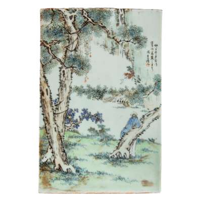 王少維款 淺絳彩登高望遠題詩紋瓷板