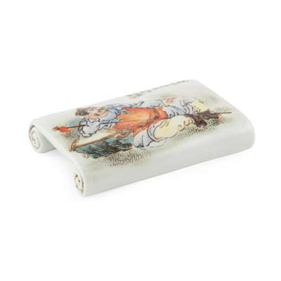 in the form of an open scroll, painted on top with a figure lying down leaning on a rock resting his weapon, inscribed on top right, dated to the year of Wu Zi, signed 'Wu Ji Zhen' and stamped, the base further with a seal mark
