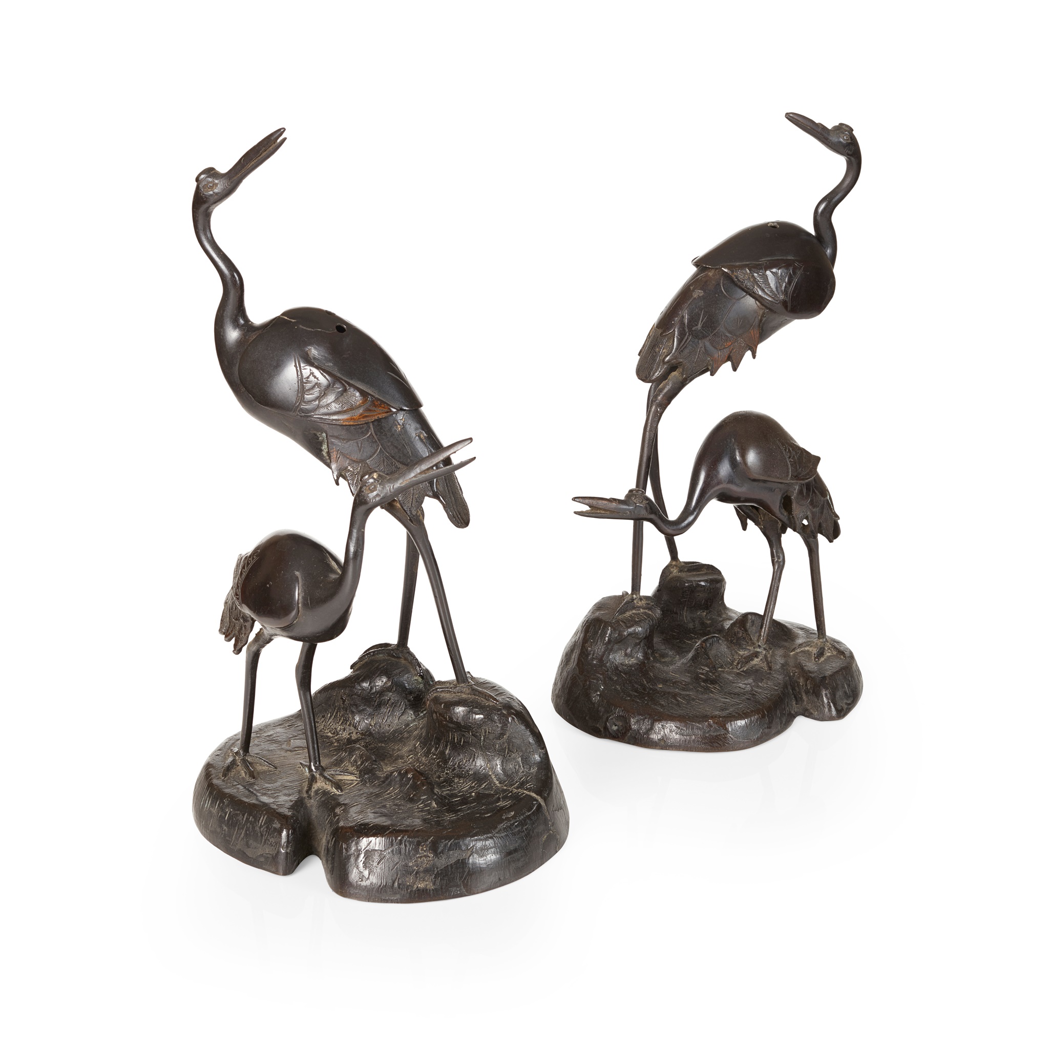 each cast as a figural group of two cranes, arched back and wings of the larger crane with three perforations as cover, the body hollowed out as vessel