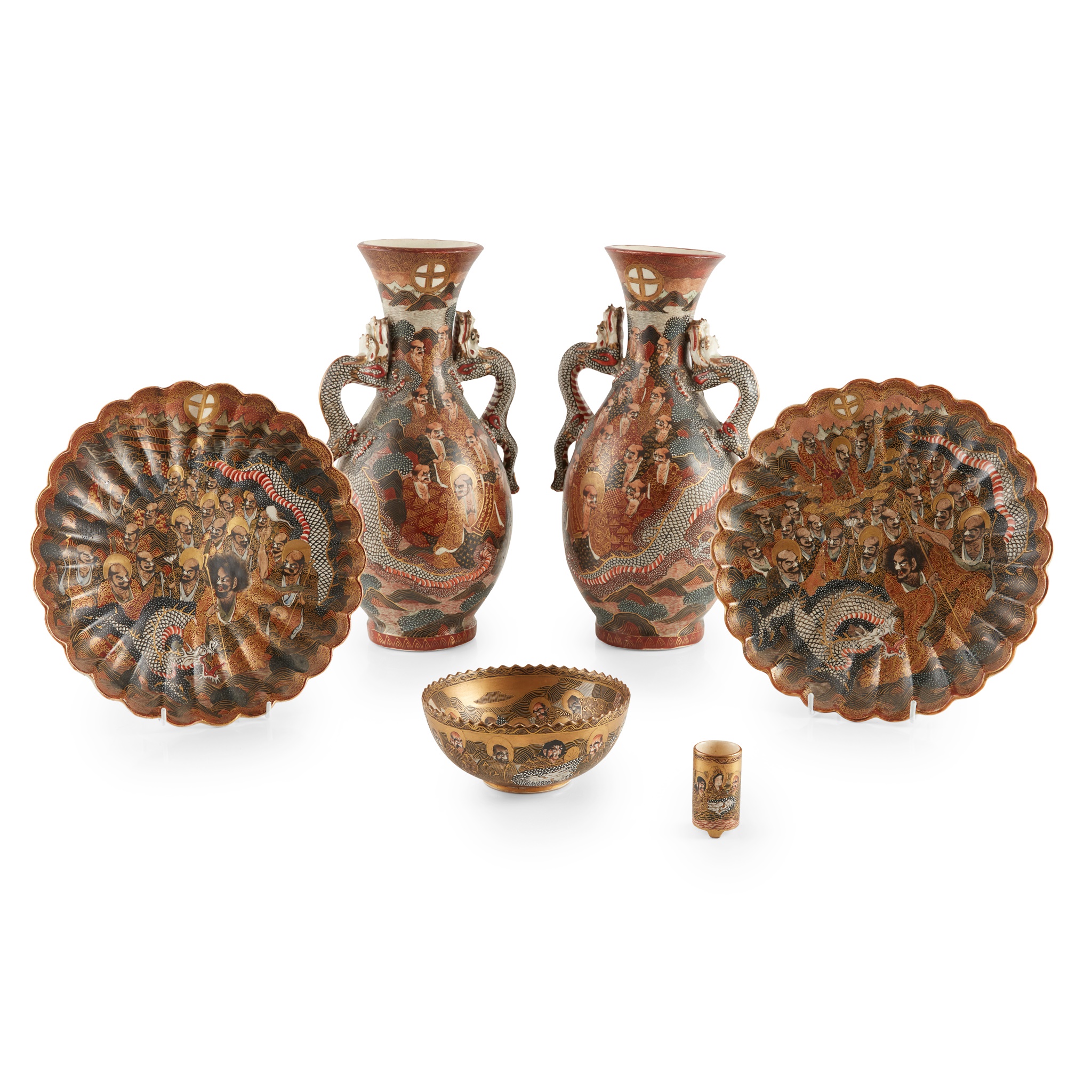 GROUP OF SIX 'RAKAN AND DRAGON' SATSUMA WARES