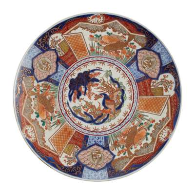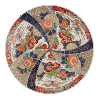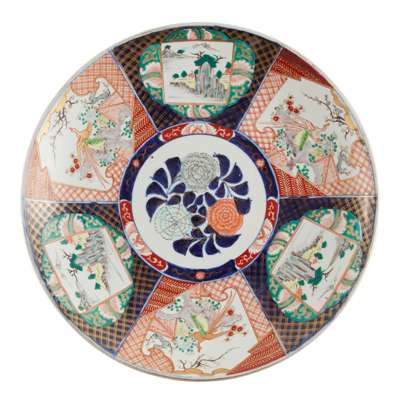 comprising: one decorated with chrysanthemums and butterflies with three swirling bands emanating from the centre; one with phoenix and flower on the central medallion, enclosed by cartouches decorated with koi fish; and one with three chrysanthemums on the centre, mountainous landscape and pheasant on the outer panels