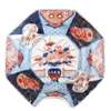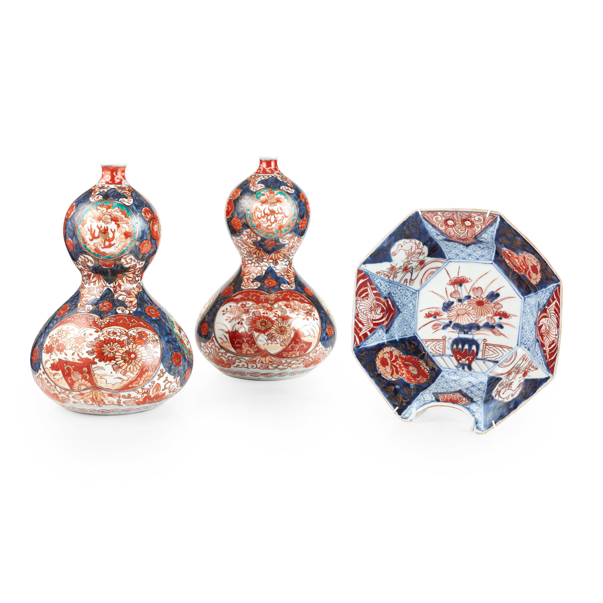 comprising: a pair of double-gourd vases, each painted with chrysanthemum, prunus, and stylised bats in roundels against an underglaze blue ground with iron-red and gilt flowers; and an octagonal barber's bowl with its centre decorated with a vase arranged with flowers