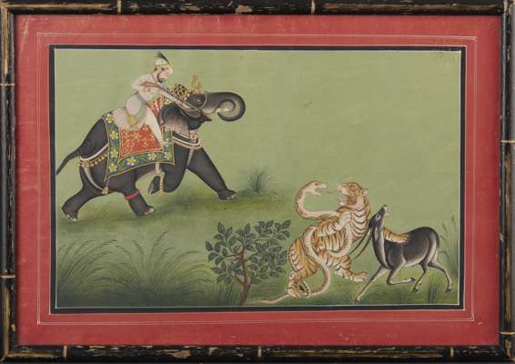 SIKH MAHARAJA ON AN ELEPHANT HUNTING SNAKE ENWRAPPED TIGER AND ANTELOPE
