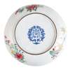 each decorated to the centre with butterflies hovering and perching on peony, begonia, and morning glory sprays in a lobbed floriform cartouche against a blue interlocking Y-pattern ground, the border with floral and fruit panels intermittent with shou motifs on a lime-green diaper ground, three floral sprays further painted on the outer cavetto, the base boldly painted with a shou character flanked by twin stylised Kui-dragons in blue enamel