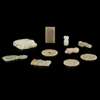 comprising: three celadon jade circular plaques, respectively carved with bats and coin, ruyi-cloud and flower arrangement motif; two celadon jade rectangular jade plaques, one depicting prunus and the other lotus pond with fish; one celadon jade boy holding a leaf; one pale celadon jade 'double-boy; one celadon jade 'ruyi' carving; one brownish-white jade 'Buddha's hand' pendant; and a large pale celadon jade 'melon and boy' carving