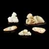 comprising: the largest, a celadon jade ornament of a recumbent horse and a foreigner, on a fitted wooden base; a celadon jade qilin holding lingzhi fungus on its mouth; a very pale celadon jade with russet skin recumbent hound; a pale celadon jade squirrel with grapes; and a white jade carving on a recumbent elephant mounted by a foreigner, with a fitted wooden base
