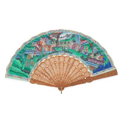 the fan leaves vividly painted on both sides with figures amongst terraced pavilions, each figure with finely detailed faces on ivory and applied silk clothing, the guards carved in relief with figures in pavilions and sticks in openwork with geometric patterns