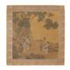 ink and colour on silk, depicting four men enjoying having tea and conversation under a large pine tree in an outdoor setting, attached to a thin paper then mounted