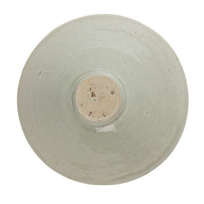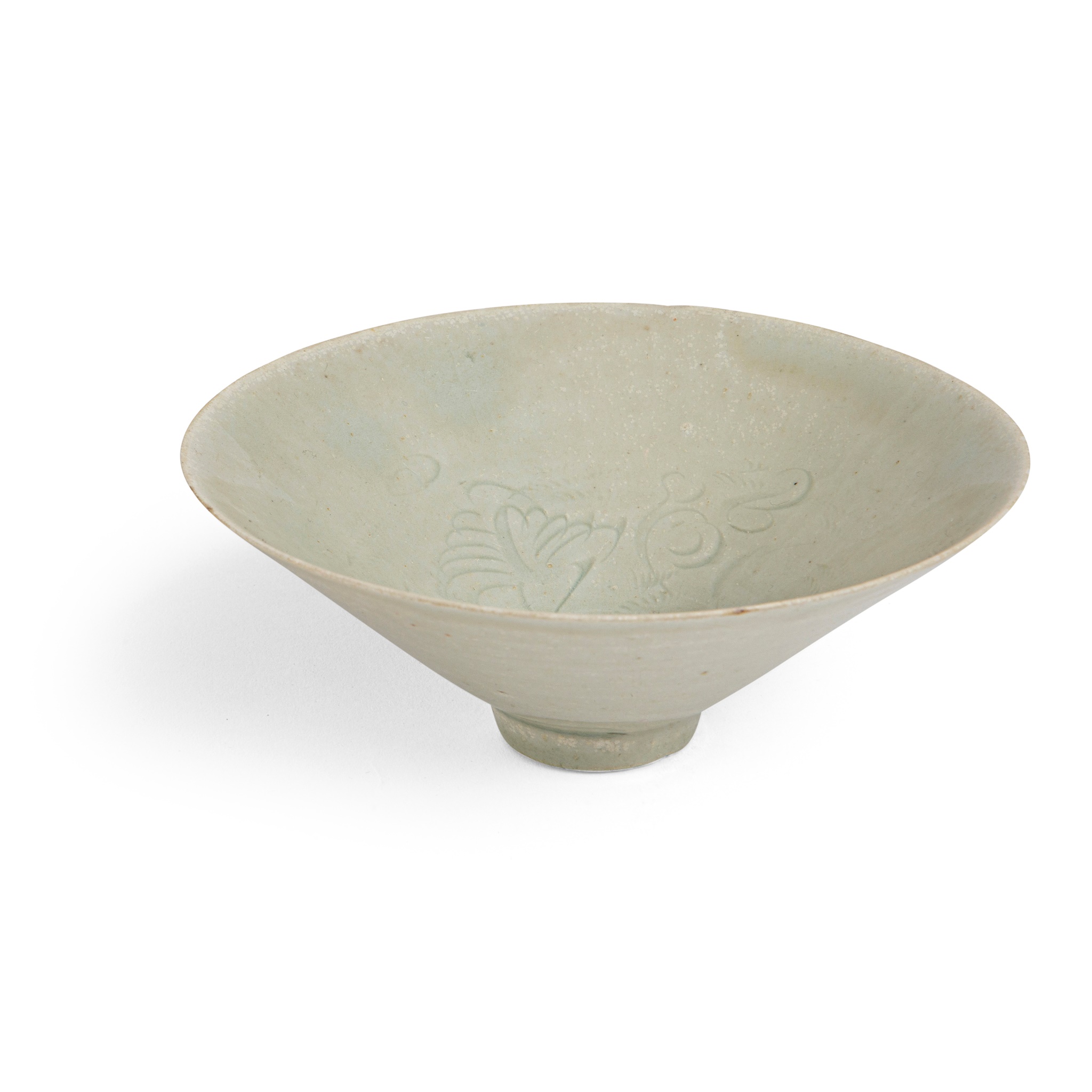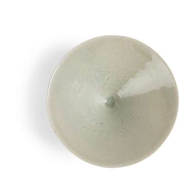 supported on a short disc-shaped foot and extending toward tapering sides, the interior engraved with flower motifs, covered overall with a pale-blue glaze, leaving only the foot base unglazed and revealing the fine porcelain body