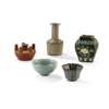 仿哥釉紙槌瓶、法華彩花卉紋方罐、醬釉六孔花插、粉青釉茶碗 及 仿官窯六瓣花口杯(一組五件)