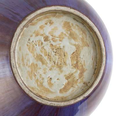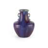 heavily potted in compressed baluster form, covered overall in the exterior with a thick red glaze suffused with lavender and blue streaks, moulded to the neck with a pair of loop handles, the base carved with a six-character Qianlong mark