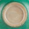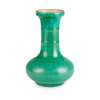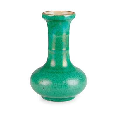 the compressed globular body surmounted by a tall cylindrical neck with three horizontal ribs raised to the wide rounded mouth, covered overall in a pale apple-green glaze suffused with black crackles