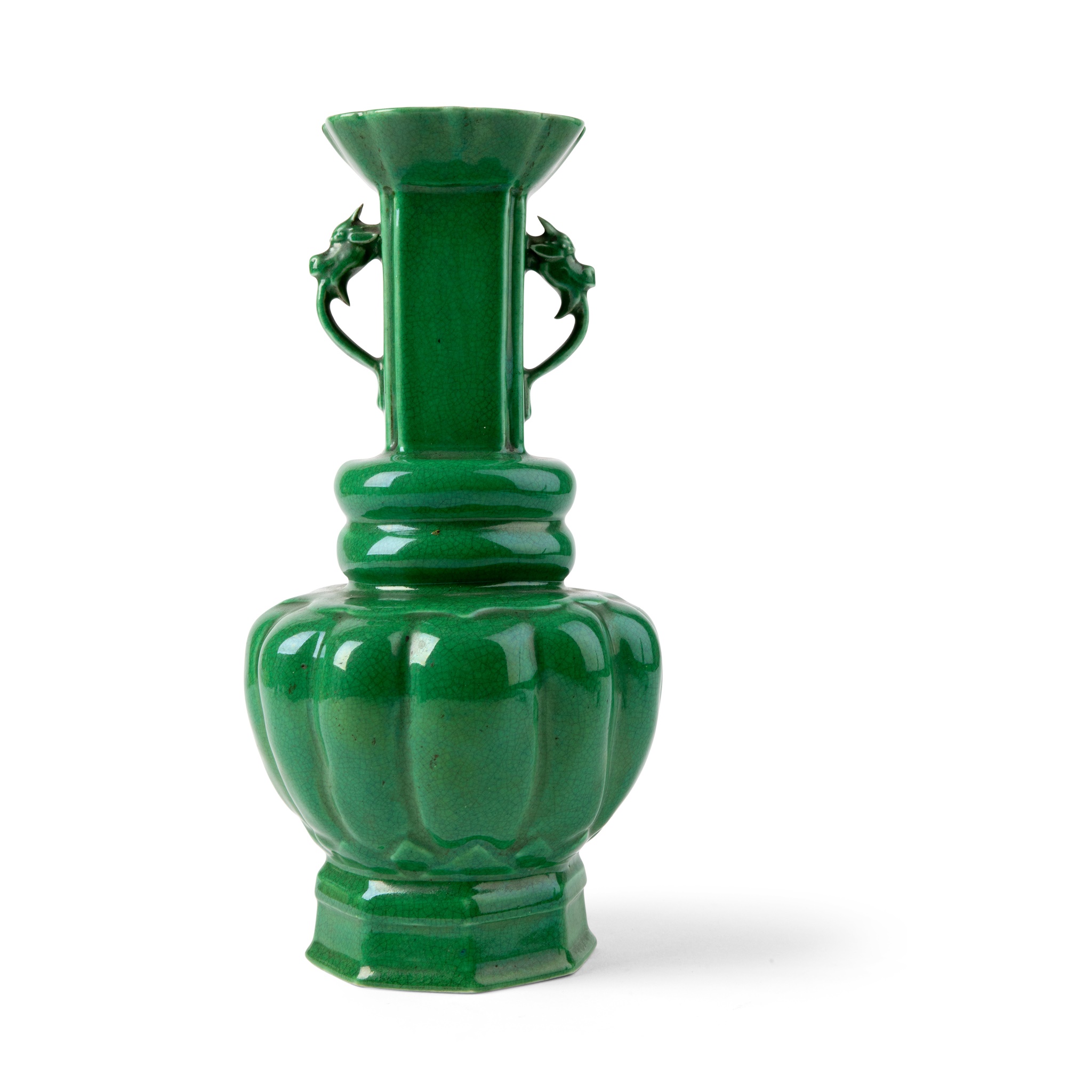 the lobed globular body supported on an octagonal foot, the rectangular neck surmounted on two oval steps and terminating into a foliate everted rim, flanked by two dragon-headed loop handles, covered overall with an apple-green glaze suffused with a fine network of russet colour