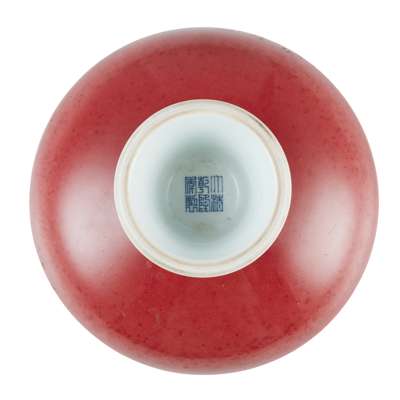 the shallow dish with slightly rounded, flared sides raised on a spreading pedestal foot encircled by a bow-string band, the exterior covered with a glaze of soft strawberry-red colour, the interior and base glazed white, the base inscribed with a six-character Qianlong mark in underglaze blue