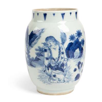 the exterior finely painted with four immortals in nature with a waterfall, all between two bands of incised flowers and wavey patterns