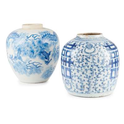 one 'marriage' jar inscribed with three large 'xi (double happiness)' characters on a tendril ground; and the other soft-paste jar painted with a large four-clawed dragon amidst clouds