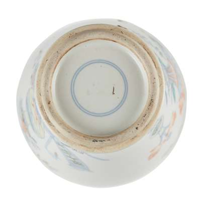 painted on both sides with 'bogu' motif, arrangements of hundred antiques, the base with a double-circle in underglaze blue