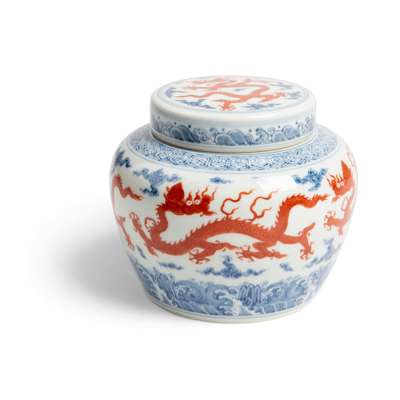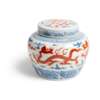 BLUE AND WHITE WITH IRON-RED 'DRAGON' LIDDED JAR