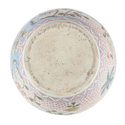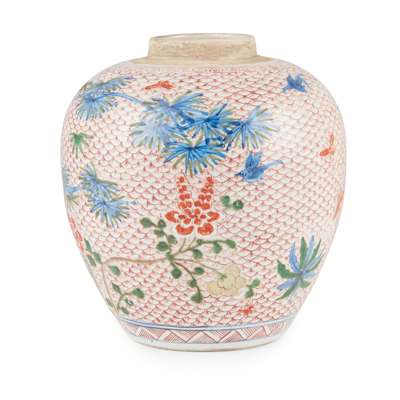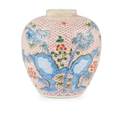 sturdily potted, painted on the body with bamboo growing from rockwork amongst flowers with butterflies and birds, all against a geometric ground